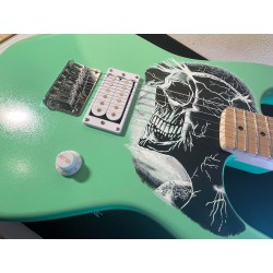 La guitare a été peinte, puis verni avec un verni brillant pour protéger le tout.
